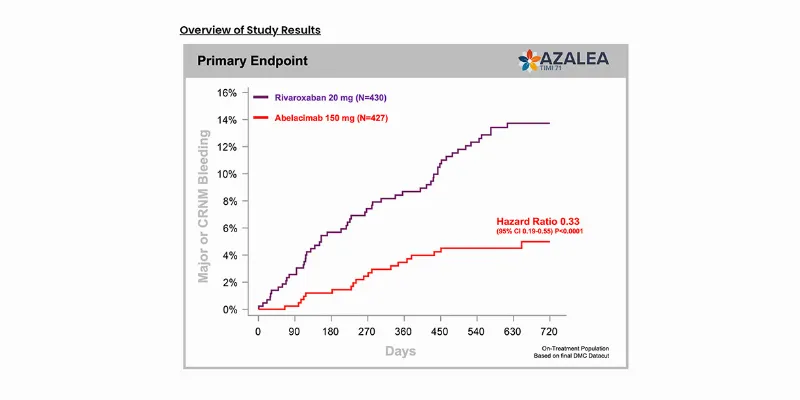 “With a substantial 67% lower risk of bleeding for the combined primary endpoint of major or clinically relevant non-major bleeding, these ground-breaking results not only support the superior safety of abelacimab as compared with a commonly used DOAC, but also strongly supports the promise of Factor XI inhibition as a paradigm-shifting treatment approach,” said Christian T. Ruff, MD, MPH, Principal Investigator, AZALEA-TIMI 71.